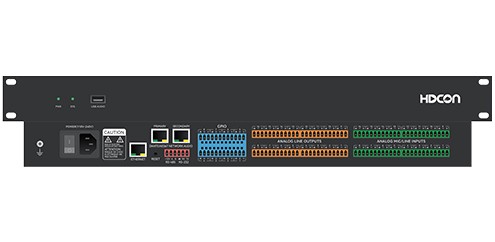 16进16出数字音频处理器HT-ADI1616PRO,16路平衡式话筒/线路、16路AES67输入,具有48V幻象供电软开关,16路平衡式线路、16路AES67输出。支持反馈、自动增益、回声消除、噪声增益补偿、自动混音、噪声抑制、中控控制。