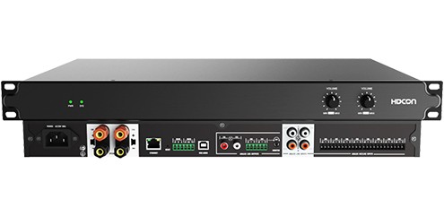 DSP数字音频功放一体机HT-DSP1208,支持8路Mic/线路通道,4路线路输出通道。支持2路150W功放输出通道。